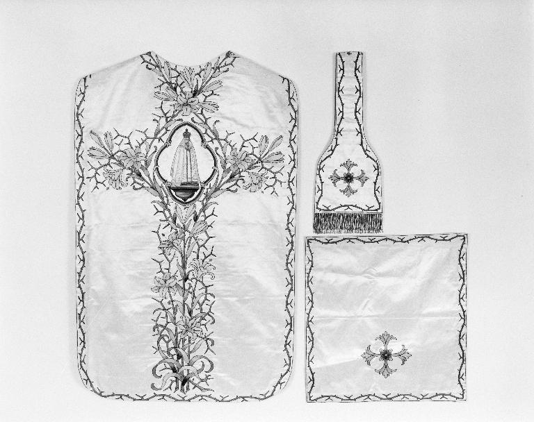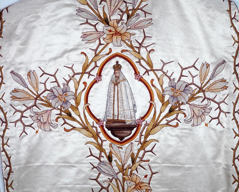 Le vocable de la paroisse Notre-Dame du Roncier est parfaitement évoqué par le décor de cette chasuble de satin blanc : des branches de lys et d'épines entremêlées dessinent la croix et la colonne. En son centre, la statue de la Vierge porte le costume de procession, qui reprend, en blanc, celui du 19e siècle. Sa couronne fermée rappelle cette que bénit l'évêque de Vannes, lors du couronnement le 8 septembre 1868 et qui est conservée. La broderie au point de chaînette est caractéristique de la machine à broder inventée à la fin du siècle dernier, datation qui s'accorde avec le style Art nouveau du dessin.
