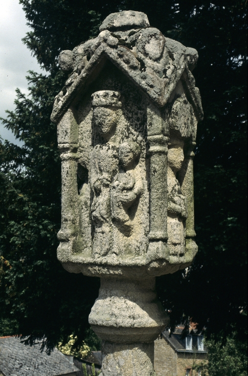 Croix monolithe à bâtière ; fût circulaire écoté enfoncé dans un socle de granite posé sur un soubassement de pierre de taille. Décor en haut relief et en demi-relief ; sur une face : Christ en croix ; sur l'autre face : Vierge à l'Enfant couronnée ; sur les faces latérales : saint Laurent et saint Jean-Baptiste ; chaque face comporte une bâtière. Sur le socle, sur la face portant le Christ en croix : la Visitation (?).