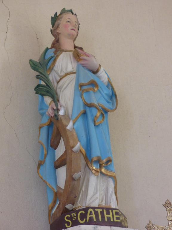 Sainte Catherine d'Alexandrie est représentée debout tenant un livre dans sa main gauche posé contre sa poitrine. A dextre, elle tient une palme tout en appuyant sa main sur une grande roue dentée disposée à côté. Elle est vêtue d'une robe ceinturée à la taille et d'un manteau retenu par deux fermaux et un ruban. Le drapé du manteau décrit différentes courbes et contre-courbes et se déploie autour du bras gauche. Elle porte une couronne de laurier.