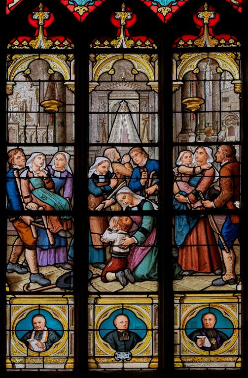 Le renouveau du culte marial durant la seconde moitié du 19e siècle et le changement de statut de l'église, élevée au rang de basilique en 1891, entraînèrent une vaste campagne de commande de vitraux. L'atelier du Carmel du Mans avait déjà signé la restauration de trois verrières du 15e siècle lorsqu'il se vit confier, en 1893, sous l'autorité du maître verrier Hucher, la fabrication de six verrières historiées dont certaines évoquent l'origine du sanctuaire et du culte qui s'y rattache.