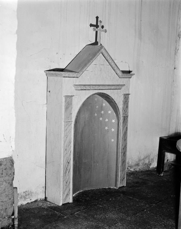 Parties constituantes non étudiéessocle, chandelier, lustre, tronc, autel, statue, verrière, tableau, vase d'autel, pupitre à lire, livre, cloche, tombeau, dalle funéraire, croix d'autel, lampe de sanctuaire, seau à eau bénite, prie-Dieu, banc, tronc, couronne, chandelier