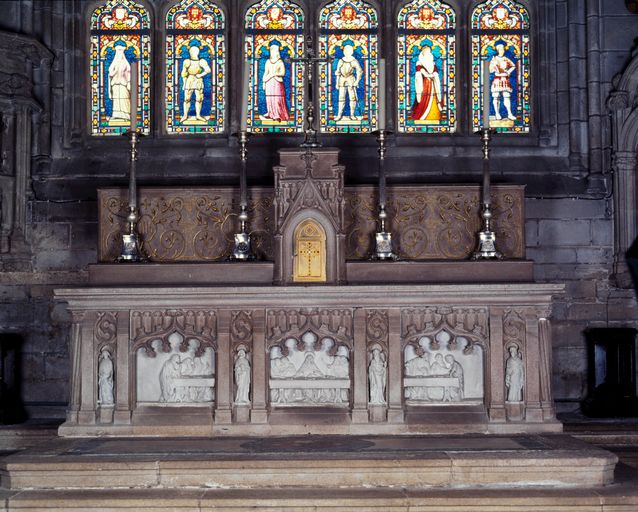 Autel en granite exécuté en 1885 par Y. Hernot et fils, de Lannion ; haut-relief et statuettes exécutés en 1893 par H. Greber de Paris.