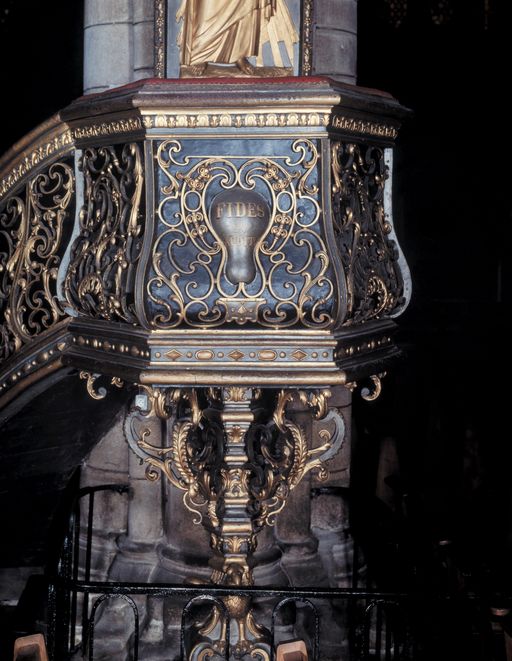 Eustache Roussin, maître serrurier originaire de Josselin, exécuta en 1771, pour la cathédrale de Vannes, une clôture de chœur et des garde-corps. Il est encore cité, mais sans preuve, comme orfèvre et forgeron du roi Louis XV pour avoir contribué à la fabrication des grilles du château de Versailles et du Palais de Justice de Paris. Dans sa ville natale, il est l'auteur présumé de l'ancienne clôture liturgique provenant du chœur de l'église et actuellement placée dans la chapelle nord. Il signa cette belle chaire à prêcher de style rocaille, réalisée entre 1781 et 1785. Rampe, culot, dorsal et abat-voix sont exécutés en fer forgé repoussé, ajouré, peint ou doré. Conforme à l'iconographie des chaires destinées à diffuser la parole du Christ transcrite par les évangélistes, le culot se termine par une représentation d'une figure d'homme, symbole de saint Mathieu, entourée de l'aigle de saint Jean, du bœuf de saint Luc et du lion de saint Marc. On rapproche, à juste titre, cette chaire de celle de Carnac (Morbihan), autre œuvre majeure de Roussin. La rareté du matériau employé et la qualité de l'exécution font des créations de Roussin des témoins essentiels de la ferronnerie d'art du XVIIIe siècle en Bretagne.