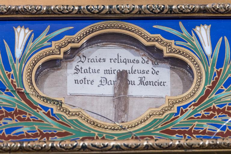 Ce reliquaire contient un fragment de la statue de Notre-Dame du Roncier, brûlée pendant la Révolution. Il affirme la continuité du culte à la patronne de Josselin malgré le remplacement de la statue.