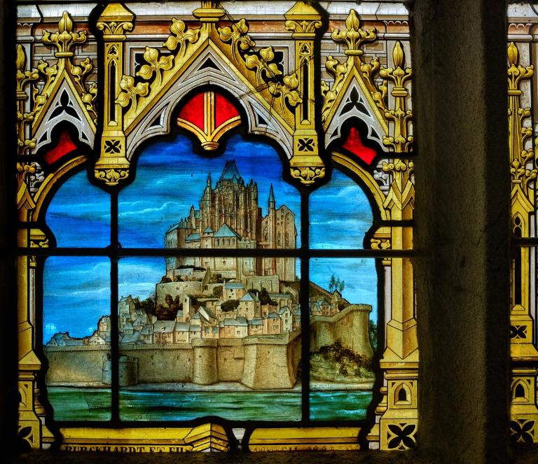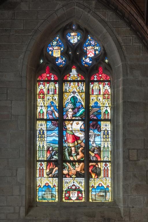 Verrières à trois lancettes trilobées et tympan ajouré. Le registre supérieur est occupé par la scène principale ; le registre inférieur est divisé en trois panneaux : Mont-Saint-Michel ; écu portant la devise attribuée à saint Michel : QUIS UT DEUS ; Maison de la rue Saint-Michel à Josselin. Les ajours sont occupés par des armoiries.