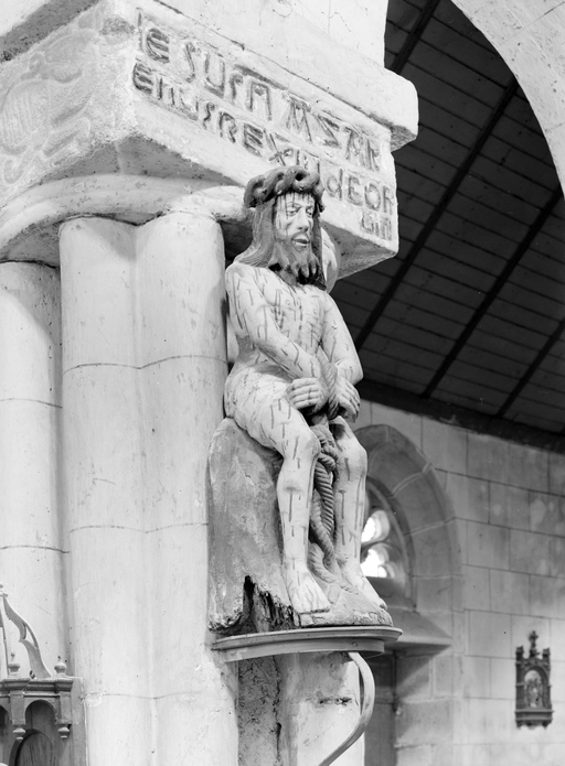 Le Christ est assis. Il porte le perizonium. Son corps est couvert d’entailles qui saignent abondamment. Son torse est maigre : on peut compter ses côtes.