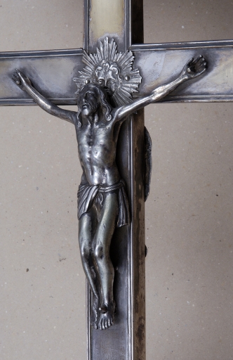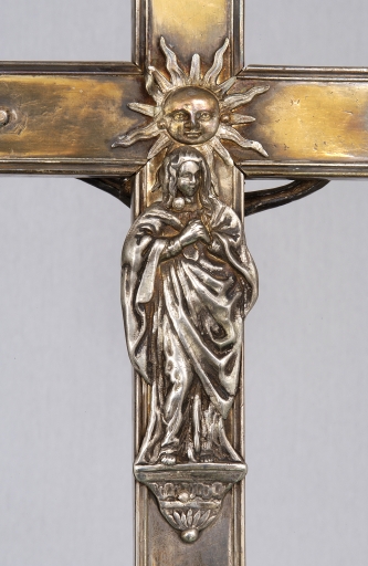 Croix de procession en argent sur âme de bois. Le Christ en croix et la Vierge à l'Enfant sont rapportés.