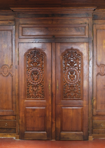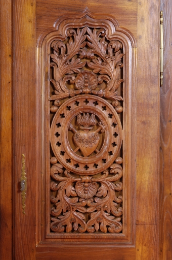 Les battants d'une armoire sont ajourés de motifs à coquille, à palme et à quatre feuilles ainsi que du sacré-coeur.