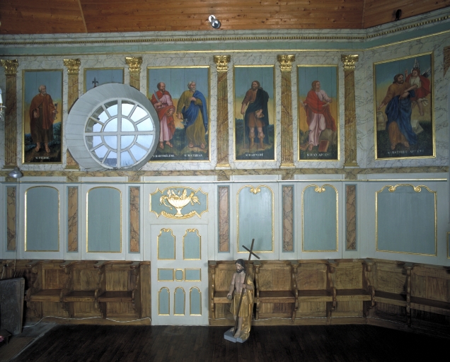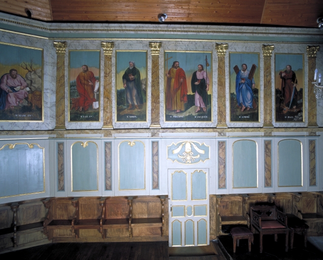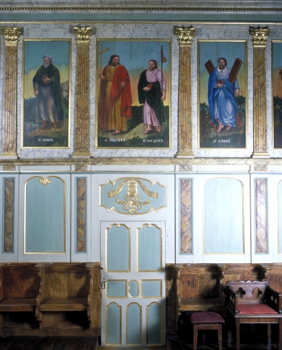 Inscription sur le lambris, au nord : Pierre, Barthélémy, Mathias, Barnabé, Jean apôtre, Mathieu évangéliste. Inscription sur le lambris, au sud : Paul, André, Jacques, Philippe, Simon, Luc, Marc.
