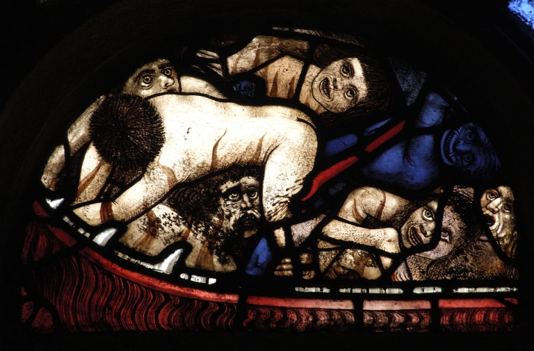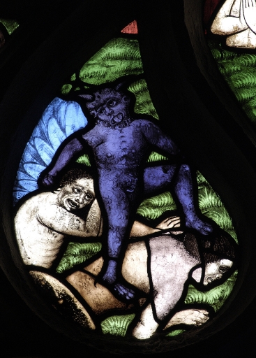 Le thème du Jugement dernier où les maudits sont tourmentés par les démons et les élus glorifiés par Dieu est mis en scène d'une manière pathétique dans ce détail faisant partie d'un réseau vitré de la première moitié du XVIe siècle. La scène s'inscrit dans une composition plus vaste, dans laquelle le maître-verrier inconnu a su concentrer un discours ample et narratif si fréquemment sculpté sur les tympans des cathédrales. Le dessin des visages presque caricaturés, sans équivalent dans la peinture sur verre en Bretagne, n'est pas sans évoquer l'époque contemporaine et l'imagination écartelée de certains expressionnistes allemands des années 1920.