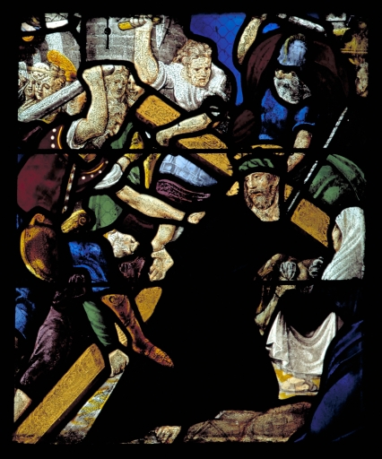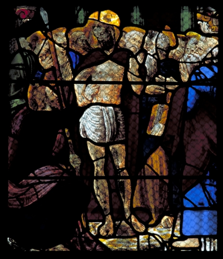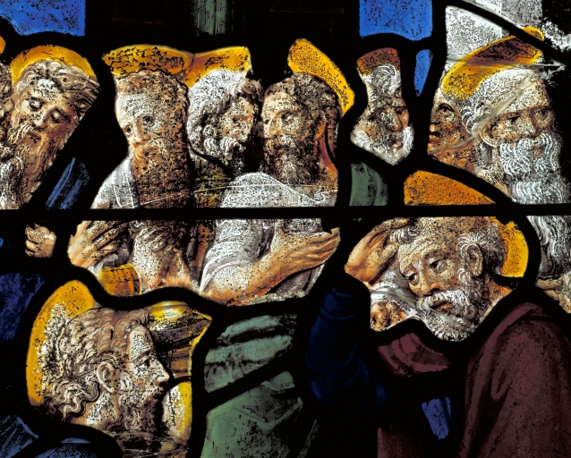 Nombreuses restaurations peu avant 1863 : d'une manière générale, les vêtements noirs et les verres bleus sans grisaille sont modernes. Les panneaux sont coupés, incomplets.