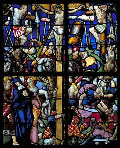 La verrière axiale met en scène la Crucifixion : sur les deux registres médians, le Christ en croix, dont un soldat à cheval perce le coeur de sa lance, est encadré des deux larrons. Au pied de la croix, la Vierge soutenue par saint Jean et une sainte femme ; sainte Madeleine est agenouillée au pied de la croix ; à droite, les soldats se disputent les vêtements du Christ. Le registre inférieur est occupé par la mise au tombeau : le Christ est allongé dans son linceul tenu par deux porteurs ; au pied du tombeau, la Madeleine agenouillée. Entourant le tombeau, le Vierge, saint Jean, les Saintes Femmes. Une inscription sur le tombeau : " XV de Juill..". Dans l'arc plein cintre, un évêque est encadré de deux blasons aux armes d'une famille non identifiée (trois coquilles d'or) d'un côté, et de Bretagne en alliance avec cette même famille. La verrière nord met en scène des épisodes de la Passion du Christ, de haut en bas et de gauche à droite : le Christ devant Caïphe, le portement de croix, le jardin des oliviers, le Christ recollant l'oreille du centurion, la cène, le lavement des pieds. Dans le cintre apparaît le christ en croix. Dans la verrière sud, au niveau du cintre, anges présentant un blason (moderne), accompagné de la dte, 1575. Ensuite, de haut en bas et de droite à gauche : 3e registre, panneau de gauche : le Christ montrant ses plaies à saint Thomas, panneau de droite, détail de l'Ascension ; deuxième registre, panneau de gauche, le Christ en jardinier apparaissant à Marie-Madeleine, panneau de droite, partie d'une scène de mise au tombeau ; premier registre, panneau gauche : personnage non identifié, panneau droit : le Christ sortant du tombeau.