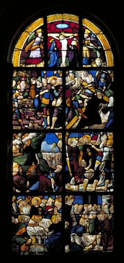 Verrières divisées verticalement en deux par une barlottière et horizontalement par trois autres. Le quatrième registre au niveau de l'arc plein cintre contient des vitraux sans rapport avec ceux des trois premiers registres, ornés de scènes christologiques.