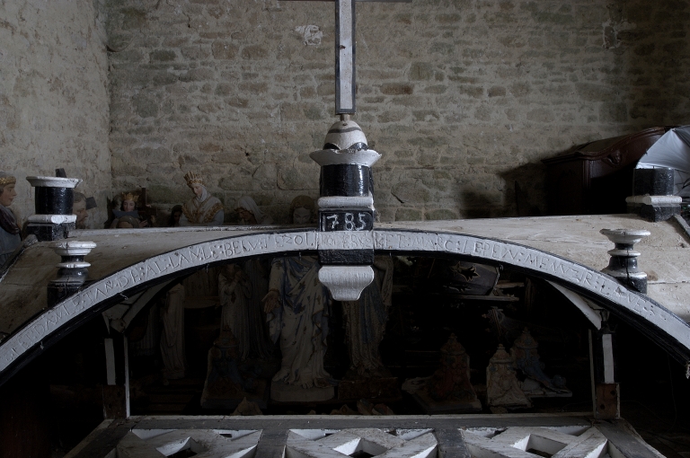 Inscription en français : "Dan Le Tan de Allan Le Belu-Tezolir de Bizi et Marc Le Pen Menuzir l'ane 1785" Dans le temps de Allan Le Belu trésorier de Bieuzy et Marc Le Pen menuisier, l'année 1785).