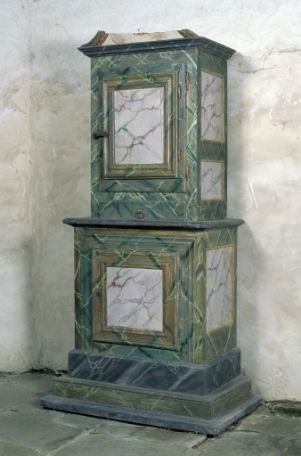 Armoire à deux corps superposés de dimensions inégales, couronnés d'un fronton. Le corps inférieur à montants et traverse moulurés est doté d'un tiroir et d'un battant assemblé à coupe d'onglet. Le corps supérieur possède deux battants supérposés, le premier vitré servant de monstrance, le second assemblé à coupe d'onglet. Les fiches sont en fer forgé, de même que l'entrée de serrure en amande (corps supérieur), un crochet de fixation à oeil et la poignée sur platine du tiroir.