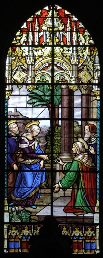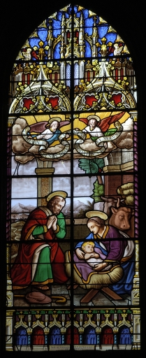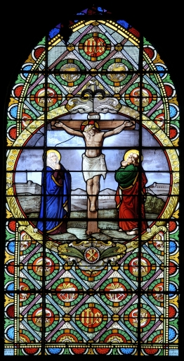 Cette série de verrières est réalisée en 1885 par l'atelier Hucher et Fils, fabrique du Carmel du Mans dont le nom est aposé sur les oeuvres.