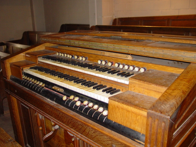 Harmonium sur pieds (4) et son siège sur estrade fixe en menuiserie. Clavier double et deux rangs de pistons protégés sous abattants repliables en deux parties. Touches des claviers en bois noir et ivoire, pistons en bois tourné et plaques en ivoire, gravées serties de cuivre. Pédales de soufflerie (2) et manivelle de soufflerie latérale. L'ensemble est placé dans l'encorbellement de la tribune.