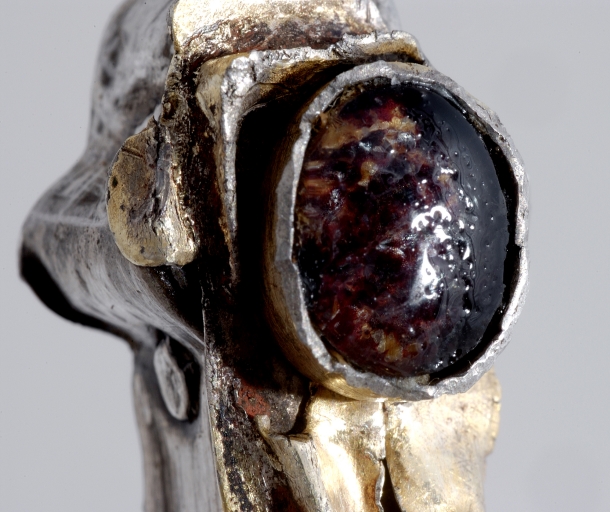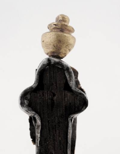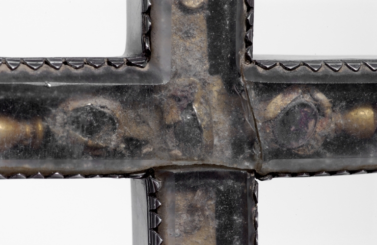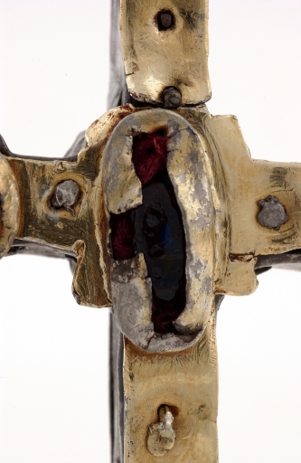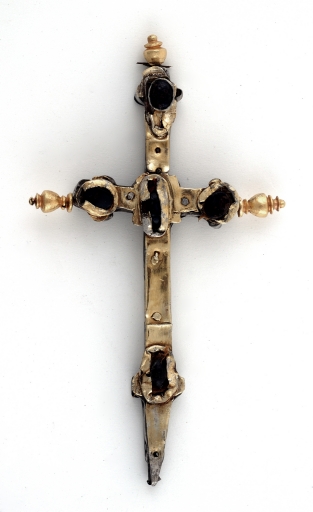 L'aspect actuel très altéré de la croix contenue dont les bâtes, écrasées ne sertissent pratiquement plus les pierres, est indéniablement le résultat d'un vandalisme ancien. Malgré ces dégradations, la silhouette de l'objet est encore lisible : c'est celle d'une croix terminée en quadrilobes, comportant un carré à ressaut à la croisée, typologie qui permet de la rattacher au modèle médiéval. Afin de la ramener à des proportions conformes à l'esthétique moderne, l'orfèvre du XVIIIe siècle a complété ses extrémités par de petits vases tournés qui rappellent les ornements terminaux des pentures de meubles de l'époque. Enfin le pied de cette croix qui la particularité d'être effilé en pointe, comme sur les exemples de Béganne et du Guerno, confirme qu'elle était occasionnellement destinée à être exposée sur un petit socle.