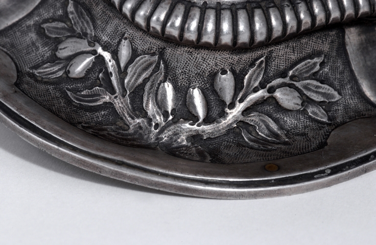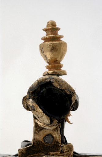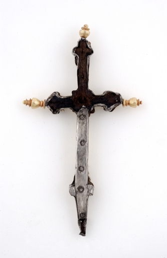 Ses terminaisons en fleurs de lys, sa base chantournée dont le dessus uni et galbé est rythmé par de simples galons godronnés, sa bordure largement évasée et ciselée de réserves mises au mat, font de cette croix-reliquaire réalisée en 1742, un bel exemple du style régence tardif auquel les orfèvres rennais demeurent attachés durant toute la première moitié du XVIIIe siècle. Les branches noueuses chargées de fruits allongés ciselés sur les côtés du pied, figuration schématique d'un olivier, font ici allusion au bois de la croix du Christ pour la relique de laquelle l'objet est destiné, conformément aux Ecritures qui rapportent "Ligna crucis Palma, cedrus, cupressis, oliva". Selon une pratique déjà rencontrée, cette croix a été expressément conçue pour contenir et servir d'écrin en même temps que de vitrine à une croix reliquaire beaucoup plus ancienne, que les verres biseautés de la face antérieure permettent d'entrevoir.