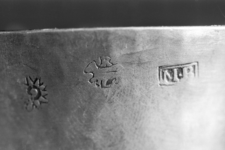 Poinçon de maître : initiales M et B avec un point au milieu, dans un cadre rectangulaire (sous la base du calice et sur le bord de la patène). Poinçon de communauté (sous la base du calice et le bord de la patène) : hermine passante avec écharpe, lettre R au dessus, lettre L entre les pattes. poinçon de charge : 9 dans un soleil (sous la base du calice) .