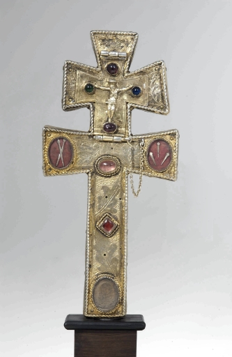 Cette provenance ancienne explique sans doute l´aspect ambivalent du présent reliquaire, En effet la forme à double traverse et la découpe empattée des bras au demeurant irrégulière, se rattachent à une tradition répandue durant tout le haut Moyen Age et veulent certainement rappeler une croix plus ancienne dont on aurait voulu ainsi conserver le souvenir. Toutefois, malgré cette forme délibérément archaïsante, la mise en oeuvre de l´objet et surtout son décor trahissent nettement une exécution de la deuxième moitié du XVe siècle, ce qu´avait déjà fort bien vu en son temps Pierre Thomas-Lacroix. Le décor de feuilles retournées, caractéristique du gothique flamboyant est gravé et détaché sur un fond mati par l'emploi de trait de gravure croisés. Ce procédé, ainsi que l´emploi systématique de cordage pour surligner les contours de la croix et border les cabochons ainsi que le style du décor lui-même sont assez caractéristiques de la fin du XVe siècle ou du tout début du XVIe siècle. Le dessin des rameaux conduit en fonction des cinq cabochons principaux, évocation des cinq plaies du Christ, prouve que ceux-ci, malgré le remplacement de leur pierres, sont d'origine, tandis qu'au revers de la croix le même décor se poursuit sans discontinuité sur un fond resté lisse. A la différence du reliquaire de Béganne, constitué d´une croix contenue ou reliquaire à proprement parler d´une sorte de coffret ou d´écrin réalisé en métal précieux, le présent reliquaire combine en un seul objet les deux fonctions. Un couvercle articulé orné d´un crucifix et de quatre cabochons, permet une fois soulevé, d´entrevoir la relique à travers un repercé en forme de grille. Si ce système de couvercle maintenu par des goupilles est indubitablement d´origine comme l´atteste l´interruption du décor gravé de feuillages gothiques de part et d´autre de la charnière inférieure, l´actuel couvercle a probablement été refait au XVIIe siècle, comme l´indique et le style du crucifix et, au revers, le monogramme du Christ, I H S, en capitales romaines, accompagné en pointe d´une grande hermine héraldique à queue largement évasée.