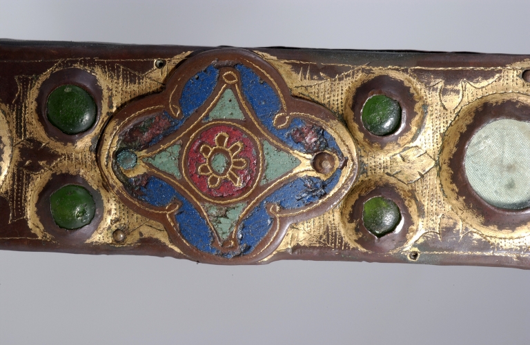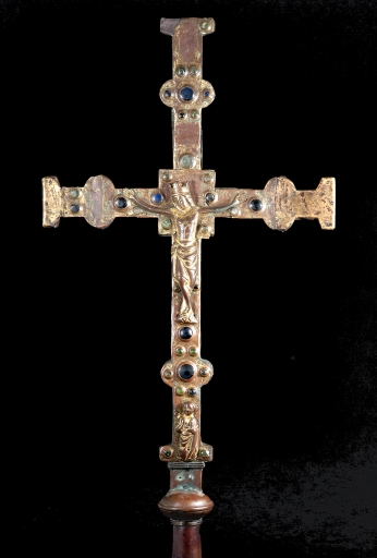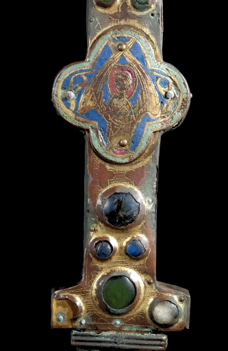 A la différence de la plupart des croix du limousin, la croix elle-même n´est pas ici en cuivre fondu mais en bois recouvert de plaques de cuivre gravées et dorées. Le décor est essentiellement obtenu à l´aide de cabochons de pâte de verre bleus et verts alternés. Ces pierres factices se détachent sur un fond mati gravé au tremblé et semé de petits motifs losangiques ou quadrilobés. La dorure des feuilles de cuivre, aujourd´hui très altérée sur la face antérieure de la croix devait contribuer pour beaucoup à l´effet de richesse de l´objet. Sur la face postérieure, les plaques émaillées selon la technique du champlevé présentent une gamme chromatique réduite : bleu intense de lapis lazuli pour les fonds, turquoise pour les bordures et rouge rubis pour les auréoles, les nuées et les attributs, gamme tout à fait caractéristique des dernières décennies du XIIIe siècle. Le parti de figures réservées en métal et non émaillées se détachant sur un fond de couleur est également typique de cette époque, de même que les rinceaux un peu raides également traités en réserve. La gravure des figures du tetramorphe et du Christ, de grande qualité, associe trois techniques, le trait continu pour les plis et les traits courts, le trait au tremblé pour les contours et le trait au pointillé pour les parties tournantes du dessin. Le Christ en croix est très semblable à celui de la croix d´Argentat, datée de la deuxième moitié du XIIIe siècle ; une reprise en ciselure visible dans les cheveux, la barbe, la couronne et le torse, contribue avec l´ensemble du décor à distinguer cette croix de la production courante de cette époque.