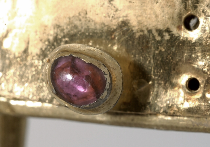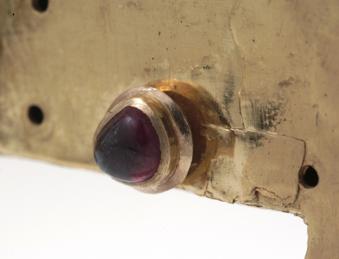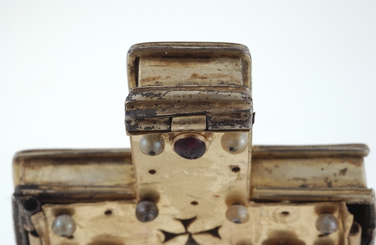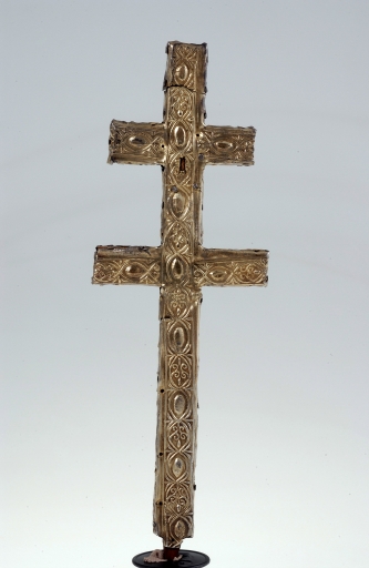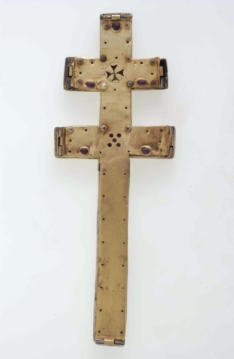 La croix "externe" qui sert en quelque sorte d'écrin à cette croix reliquaire se démarque par un type d'ornementation, exclusivement à base de perles et de pierres précieuses, en l'occurrence des rubis, très rarement rencontrée sur les pièces d'orfèvrerie bretonnes du Moyen-Age. En accord avec le luxe extrême des matériaux du décor, la plaque de la face antérieure qui lui sert de support est elle seule en or, alors que le reste de l'objet est en argent doré. Cette plaque d'or est percée à la croisée supérieure d'une petite croix pattée permettant d'entrevoir la relique -un fragment de la vraie croix-, et à la croisée inférieure de cinq trous qui symbolisent les cinq plaies du Christ. Malgré le très grand nombre de pierres et de perles disparues, il n'en reste que dix huit sur cinquante au total, il est assez aisé de restituer le principe d'alternance des perles et des rubis. Ce type d'ornementation faisant alterner des perles fines embrochées avec des pierres précieuses taillées en cabochons irréguliers et montées en bâtes fermées est parfaitement caractéristique de la fin du Moyen-Age. Plus précisément, le montage très particulier des rubis dans une bâte fermée élargie à mi hauteur dite « à cupule tronconique », le système de fermeture à charnières maintenues à l'aide de goupilles, appartiennent aux productions luxueuses du 14e siècle et du 15e siècle, à mi chemin entre le travail de l'orfèvrerie et celui de la joaillerie. La présence ancienne dans le trésor de Béganne de cette croix-reliquaire à double traverse est sans doute à rapprocher d'une antique chapelle dédiée à la sainte Croix, mentionnée sur le territoire paroissial à la fin du XIe siècle par le Cartulaire de Redon. Elle est également à rapprocher d´une croix reliquaire de forme semblable, récemment disparue, celle de Carentoir, oeuvre du XIIIe siècle issue des ateliers limousins ainsi que de celle de la Vraie Croix, réalisation sans doute bretonne de la fin du 15e siècle. D'autre part, malgré l'état extrêmement lacunaire du décor de pierreries et de perles qui a fait les frais de "prélèvements" intempestifs, il convient d'en souligner le caractère luxueux tout à fait unique dans l'orfèvrerie religieuse bretonne. Cette somptuosité sans égale parmi les oeuvres bretonnes conservées est sans doute à mettre en rapport avec le grand manoir de l'Etier situé sur la même paroisse, reconstruit à partir de 1445 par Guyon de Carné, membre du conseil privé ducal dès 1438. Ce puissant et riche personnage, issu d'un très ancien lignage breton dont le fief éponyme se trouve non loin de là sur la paroisse de Noyal-Muzillac, a fort bien pu offrir à la paroisse de Béganne ce précieux reliquaire réalisé selon le modèle des objets de dévotion privés en vogue dans les milieux princiers à partir du XIVe siècle.