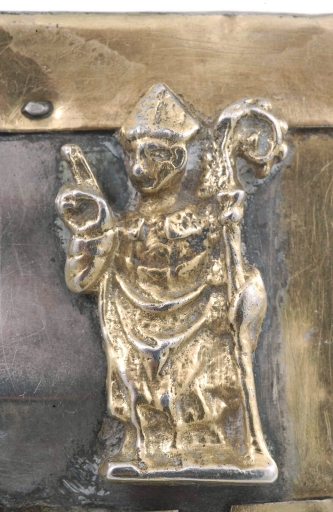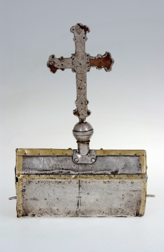 La croix à fleurons schématiques qui surmonte la châsse est recouverte d'un décor estampé de losanges et quadrilobes, qui la situent également dans la première moitié du XV siècle. Comme dans le cas de la croix contenue à l'intérieur du reliquaire de Béganne, seule la face antérieure est dorée. Les alvéoles qui marquent les quatre extrémités contiennent des petites pierres de calcaire dur légèrement rosé, provenant sans doute de Terre Sainte, peut-être même du tombeau du Christ. La minuscule croix de bois sertie au centre, qui correspond probablement à une relique de la Vraie Croix ainsi que la fragilité du garnissage d´argent donnent à penser que cette croix n´était certainement pas prévue pour être exposée ainsi de façon permanente. Il est probable que selon le même principe que le reliquaire de Béganne, cette croix, était conservée dans un autre reliquaire de forme semblable, qui devait également être en argent et lui servir d´écrin.