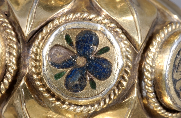 Le poinçon à l´hermine passante de Rennes ne laisse aucun doute sur le lieu de fabrication de l´objet. Il n´en est pas de même pour le poinçon de maître dont la lecture est sujette à interprétation. Pierre Thomas-Lacroix y avait déjà repéré le poinçon d'un orfèvre R M, non identifié. Ce poinçon aux initiales R et M, pourrait être celui de l´orfèvre Rolland Martin qui émarge à plusieurs reprises dans les comptes de la ville de Rennes à la fin du XVe siècle et au début du XVIe. Autre détail curieux à remarquer, le motif de quatre-feuilles gravé en méplat sur les boutons du noeud est semblable à celui qui accompagne dans les actes la signature de cet orfèvre.