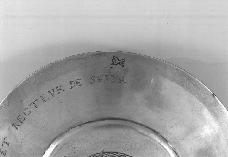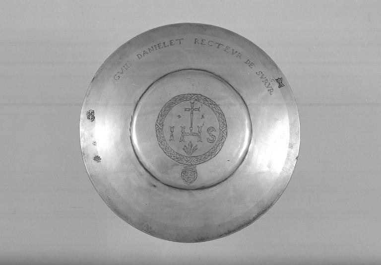 Poinçons (sur la patène et sous le pied) : initiales N et B séparées par des palmes en sautoir encadrant hermine et fleur de lys, une couronne au dessus, un motif non identifié au dessous, maître Nicolas Boullemer ; communauté de Rennes, 1697 : lettre A couronnée, une hermine entre les jambes ; charge de Rennes : chiffre 9, une fleur de lys au dessus, une hermine au dessous, dans un soleil ; décharge de Rennes : une couronne ; inscription (gravée sur la patène) : GVIL. DANIELET RECTEVR DE SVRZVR ; armoiries (gravées sur la patène) : de gueules à trois écussons d'hermines, famille de Coëtlogon.