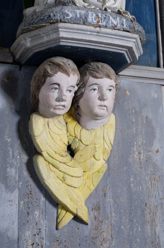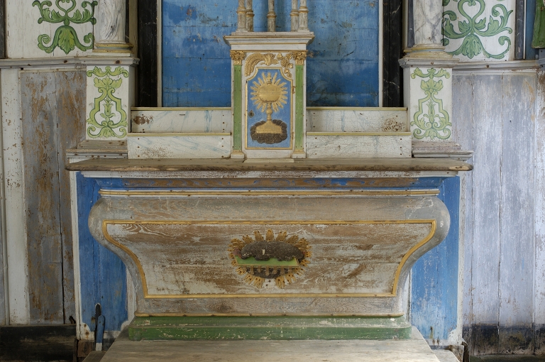 Retable plat en bois polychrome à trois travées et deux niveaux. Le tableau d'autel est encadré de deux colonnes et surmonté d'un entablement et d'un fronton cintré. Les travées latérales abritent chacune une statue ainsi que la niche supérieure encadrée de deux niches plates. Le tabernacle est surmonté d'une exposition formant baldaquin. La pierre de consécration de l'autel est en calcaire.