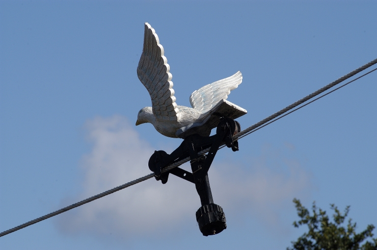 Le pardon annuel de quatre chapelles de la région, Crénénan à Ploerdut, Quelven à Guern, Saint-Nicodème et Notre-Dame de la Ferrière en Pluméliau, donne lieu à une cérémonie très particulière, la «descente de l´ange», à Quelven, Crénénan et Saint-Nicodème, l´ange prenant la forme de la colombe du Saint-Esprit à la Ferrière. Du clocher de cette dernière descend sur un câble une effigie de la colombe du Saint-Esprit qui allumait à terre un feu de joie. La statue actuelle date peut-être des années 1950 et tient autant de la colombe que de la mouette. Georges Provost a démontré que les feux de pardon ne sont pas antérieurs au XVIIIe siècle et surtout attestés en Vannetais et Trégor et que la curieuse tradition de l´ange « pyrophore» y est moins fréquente, la plus célèbre étant celle du pardon de Saint-Jean du Doigt en Trégor Finistérien. Elle serait héritée de pratiques urbaines, liées aux fêtes de cour de la période baroque.