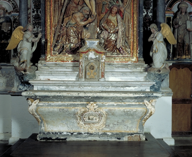 Le grand bas-relief en tuffeau qui occupe le centre du retable majeur de Saint-Nicodème représente la Descente de Croix, un des thèmes liturgiques privilégiés de la Réforme catholique au XVIIe siècle. Ce type de décor est rarement choisi chez les retabliers originaires de Laval, tel Olivier Martinet auteur présumé du retable, qui préfèrent généralement les tableaux sur toile. Le cadre rectangulaire de la scène, décalé vers le haut, est cintré au centre de son bord supérieur selon un schéma bien connu. Entablement, frise de rinceaux et corniche à denticules sont curvilignes selon la forme du bas-relief. La Descente de Croix ne comprend pas moins de dix personnages, pressés les uns contre les autres sans laisser de place aux architectures et aux paysages. En effet, l´élimination de l´accessoire au profit de l´essentiel reste une préoccupation constante de la Réforme catholique pour une épuration de la foi. Au bas de la croix face à la Vierge, Nicodème armé d´une paire de tenailles arrache les clous qui fixait les pieds du Christ. Les armoiries permettent de dater cette oeuvre et le retable qui l´abrite autour de 1650 : sur le registre supérieur, les armes d´alliance de Guengat-Rimaison correspondent au mariage de René-François de Guengat avec l´héritière de la maison locale des Rimaison, vers 1650. Les armes de Toussaint Cormier recteur de Pluméliau de 1649 à 1673 font date également car on sait qu´il réorganisa l´espace liturgique en 1656.