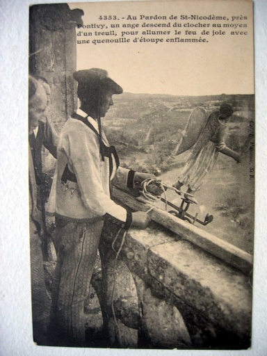 La statue est une réplique d'une statue plus ancienne. Fixée sur un support métallique, elle descend le long d'un fil de fer pour allumer un feu de joie lors du pardon de Saint-Nicodème.