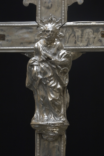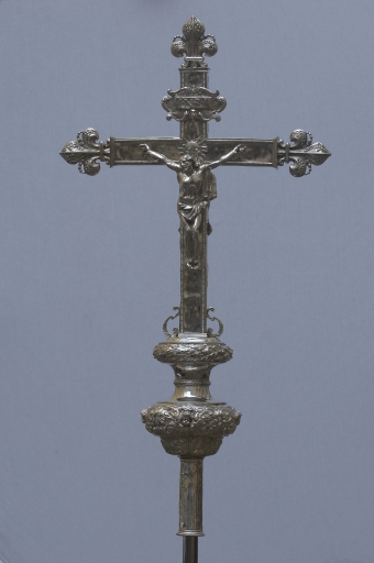 Avec ses grandes fleurs de lys fleuronnées, enrichies de pistils et de graines, cette croix représente un des premiers exemples du genre recensé en Bretagne. Ce modèle à fleur de lys, relativement moderne, tend alors à remplacer progressivement celui à têtes d'angelots qui est employé parfois jusqu'à la fin du XVIIe siècle et même encore au premier quart du XVIIIe siècle par les orfèvres de certaines provinces. Le noeud piriforme très évasé, orné d'un riche décor ciselé de t^tes d'angelots, de chutes de fruits et de fleur, le large tore de laurier qui le surmonte, rattachent l'objet à l'esthétique générale Louis XIV qui s'étend au cours de la seconde moitié du XVIIe siècle à la totalité de l'orfèvrerie religieuse pour former des ensembles assortis. Alors que le Christ et le titulus sont fondus, l'image de saint Pierre, patron de la paroisse, au revers de la croix, est un très bel exemple de repoussé-ciselé. Cette a fait récemment l'objet d'une importante et exemplaire restauration par l'atelier Evellin de Rennes.