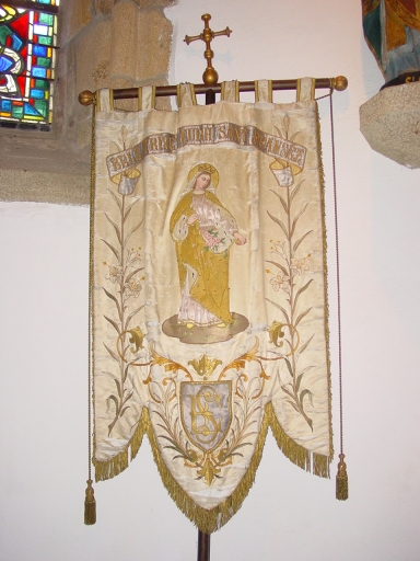 Sur l'avers en velours rouge, application du personnage avec aube en tissu brun plissé, nimbe en drap d'or, carnations en toile peinte, chapelet en bois tourné. Fleurs en soie brodées. Applications de soie blanche. Broderies en fils d'or, rembourrées sur carton. Au revers en soie blanche, application du personnage avec manteau et robe en drap d'or et soie plissée, chairs en toile peinte, rameaux en broderie de soie et application de soie. Hampe et traverse en bois tourné.