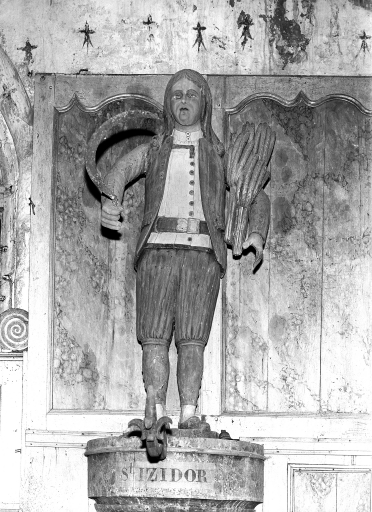 Cette statue de saint Isidore semble contemporaine au retable qui l'abrite et date de la fin du 18e siècle ou du début du 19e siècle.