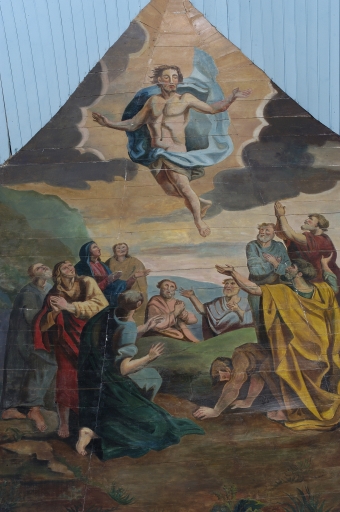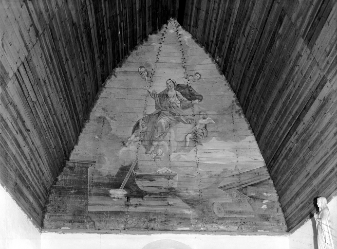 Lambris de couvrement peints de forme triangulaire figurant l'Assomption de la Vierge, au Nord, et l'Ascencion du Christ au Sud.