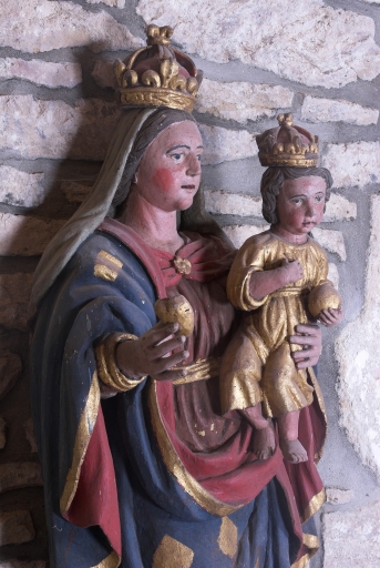 Statues anciennement restaurées avec un surpeint important, altérations de la polychromie. Des traces de dorure ancienne sous la polychromie actuelle de la Vierge laissent supposer qu'à l'origine sa robe était entièrement dorée comme celle de l'enfant Jésus. Une partie du pied droit de l'enfant est cassée.