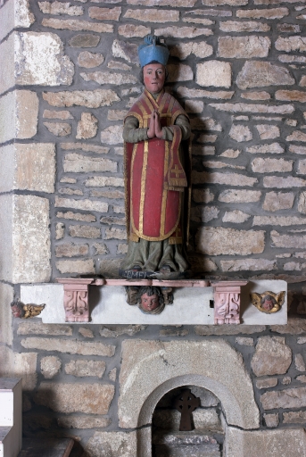 Statues datant de la 2e moitié du 17e siècle provenant probablement d'un ancien retable dont certains éléments ont été réemployés pour servir de socle. La statue de saint Mélec est à rapprocher de celle de saint Bieuzy conservée dans la Chapelle Notre-Dame-de-la-Salette à Bubry, probablement du même sculpteur et date de la 2e moitié du 17e siècle ; celle de la vierge à l'Enfant, de facture différente, semble être du 18e siècle.