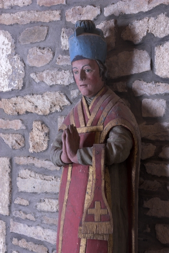 Ensemble de deux statues reposant sur des socles en bois remployant des vestiges d'un ancien retable. Les couronnes du Christ et de la Vierge, les mains du Christ et la main droite de la Vierge sont des éléments rapportés tandis que la statue de saint Mélec est en bois monoxyle, à l'exception de la partie avant du manipule qui est rapportée.