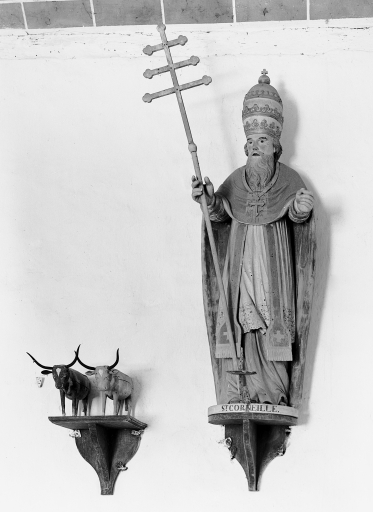 Statue de saint Cornély accompagné de deux boeufs. Certains pans du manteau, les mains et la croix du saint sont des éléments rapportés. Les pattes, les cornes et les oreilles des boeufs sont également rapportés.