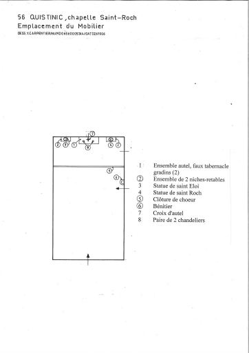 Sur les 9 objets repérés, 3 ont fait l'objet de dossiers individuels. Le mobilier de la chapelle Saint Roch se compose pour l'essentiel de deux niches retables, de la 2e moitié du 17e siècle, abritant des statues commandées dans le 1er quart du 20e siècle. Elle conserve une clôture de choeur du 18e siècle et un bénitier du 15e siècle.