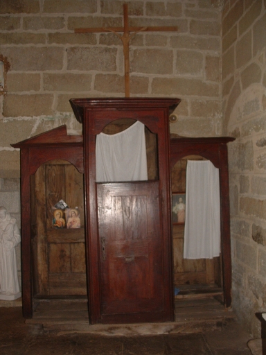 Confessionnal composé de trois loges surmontées d'une corniche, celle du centre est fermée au deux tiers par un battant assemblé à coupe d'onglet. Les côtés des loges latérales sont à quatre panneaux moulurés. Fiches à lacets et entrée de serrure en fer forgé.