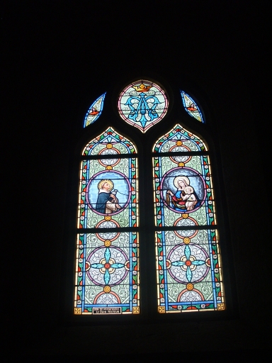 Baie O : les 4 évangélistes, saint Matthieu, saint Marc, saint Luc et saint Jean sont représentés sous des dais d'architecture. Dans le tympan, la Vierge et saint Joseph, entourés d'anges tenant un philactère, sont dominés par la Sainte Trinité (le Christ, Dieu le Père et la colombe du Saint-Esprit). Baie 1 : Apparition de la Vierge de l'Immaculée Conception. Baie 2 : Sacré Coeur de Jésus. Baie 3 : Apparition de Notre-Dame-de-la-Salette à deux enfants, Maximin et Mélanie. Baie 4 : Scène de la Crucifixion. Le Christ, crucifié, est accompagné de la Vierge, saint Jean et Marie Madeleine. Baie 5 : Education de la Vierge. Baie 6 : Moines trinitaires. Baie 7 : saint Dominique et Vierge du Rosaire en médaillon. Baie 8 : saint Yves et saint Louis en médaillon.