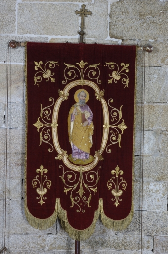 Bannière de procession à face principale en drap d'or avec application de soie blanche, noire et verte (Saint Yves). Revers en velours de soie rouge avec application de soie. Les deux faces sont ornées de broderie de fils d'or rembourrées sur carton. Les chairs sont en toile peinte. La bannière est portée sur une hampe de procession en bois.