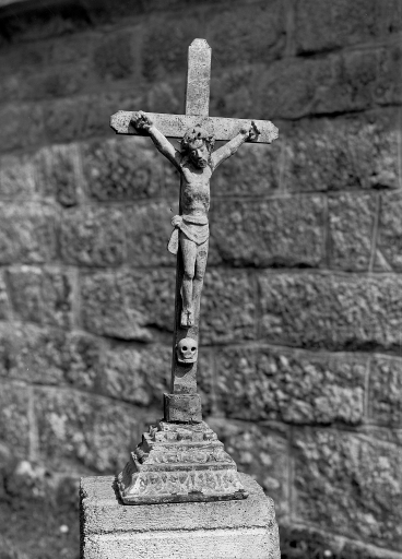 Christ en croix surmonté d'un titulus. Un crâne est placé sous ses pieds.