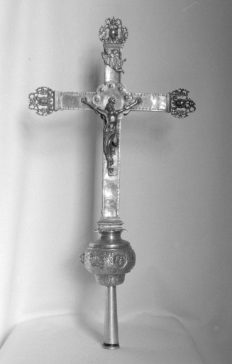 Croix de procession avec lames de cuivre argentées sur âme de bois. Fleurons fondus rapportés aux extrémités de la croix. Les têtes d'angelot, fondues, sont rapportées et soudées sur le noeud. Le Christ en croix et le titulus sont en bronze doré, fondus et rapportés. L'auréole du Christ est en cuivre doré. La Vierge à l'Enfant est en cuivre argenté, fondue et rapportée. La hampe est conservée.