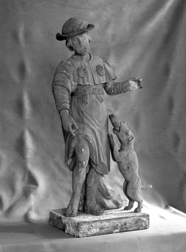 Saint Roch, en scandales, vêtu d'un chapeau à larges pans, montre de sa main droite le bubon de la peste sur sa jambe tandis que son chien, debout sur ses deux pattes arrières, lui présente un pain qu'il tient dans ses crocs.
