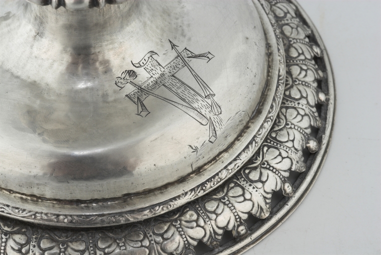 Noeud ciselé décoré de trois têtes de chérubins rapportées sur des ailes croisées ; collerettes godronnées ; pied aux feuilles d'acanthes repercées. Patène ornée en son centre des initiales I.H.S. entourées de la couronne d'épines torsadée.